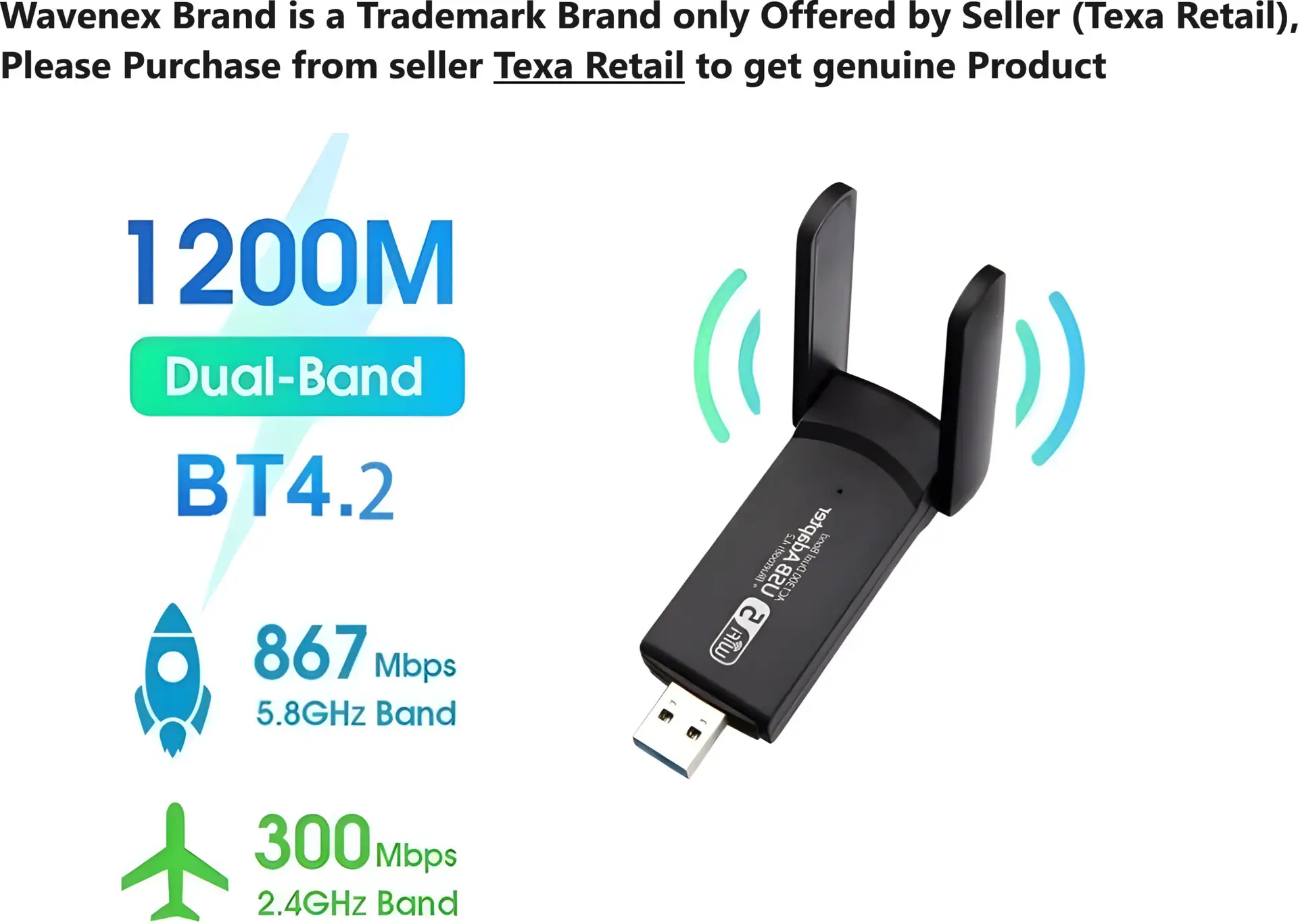 Wavenex AC1300 Dual-Band USB 3.0 Wi-Fi Adapter with Bluetooth